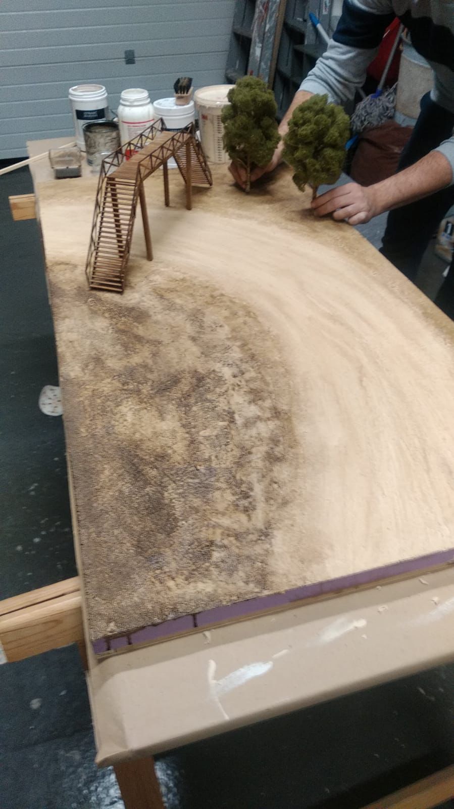 Trazado realizado a. mano con áridos finos, vegetación, mas de 30 figuras, vallas y puente de madera, motocicleta, caballos y postes de luz con cable.